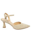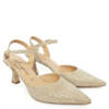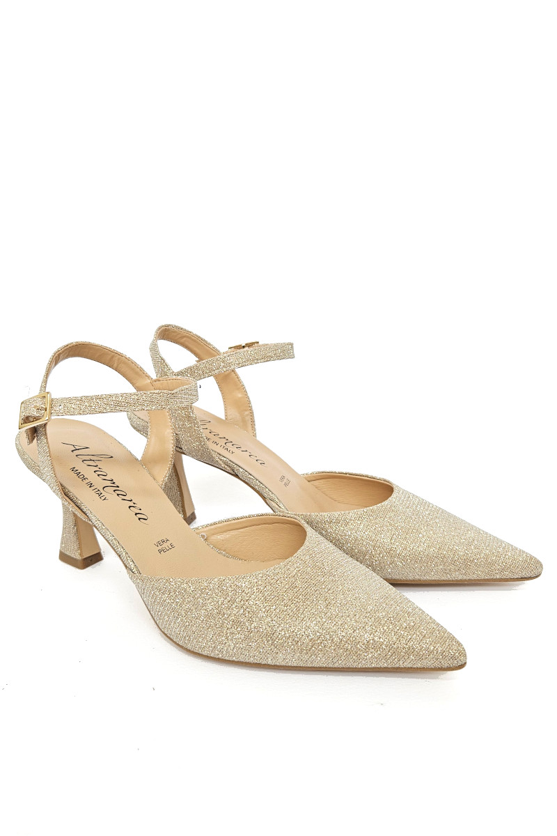 Sandalo punta chiusa perfetto per cerimonie in tessuto laminato oro. Scarpa elegante a punta con comodo tacco rocchetto 5 cm e sottopiede in pelle.