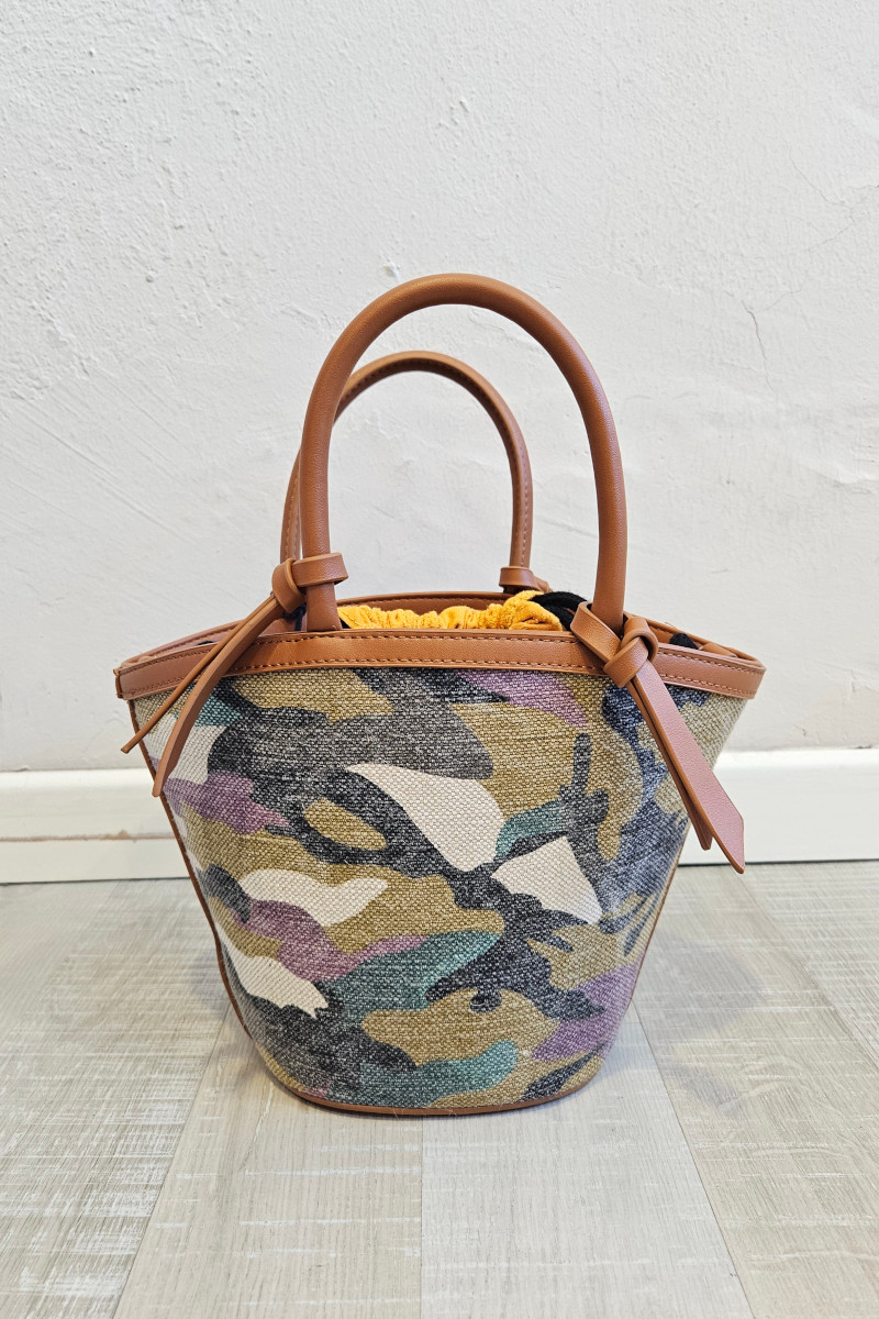 Piccola borsa a mano Custo Barcelona in tessuto canva camouflage. Piccolo secchiello da portare a mano con busta interna chiusura laccio scorrevole. Un accessorio che valorizzerà al massimo ogni tuo outfit! Tracolla lunga interna.