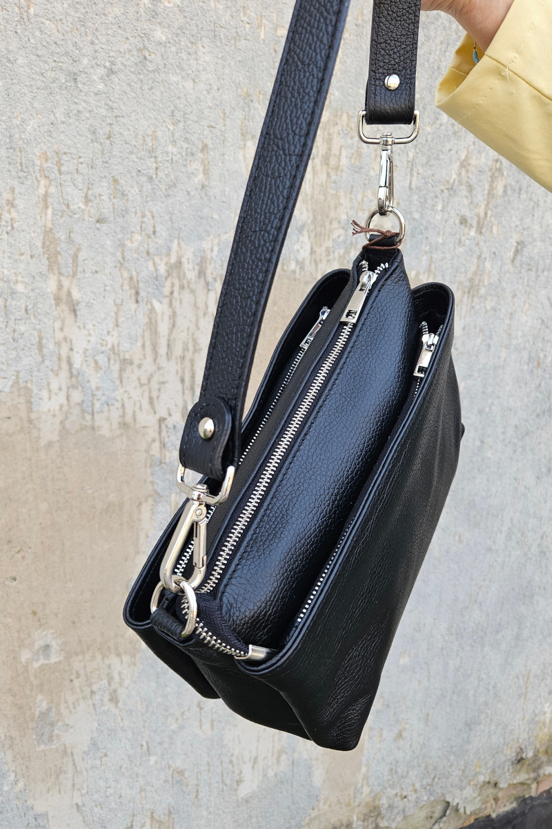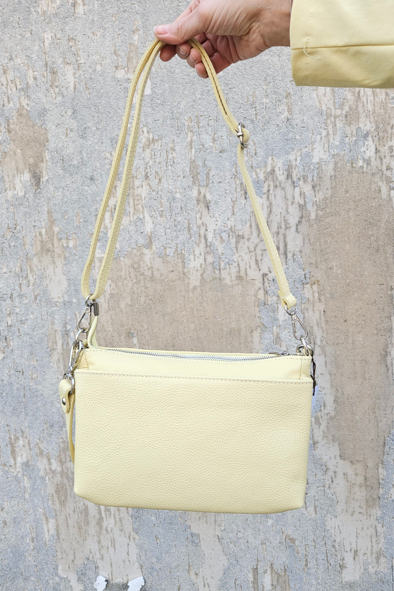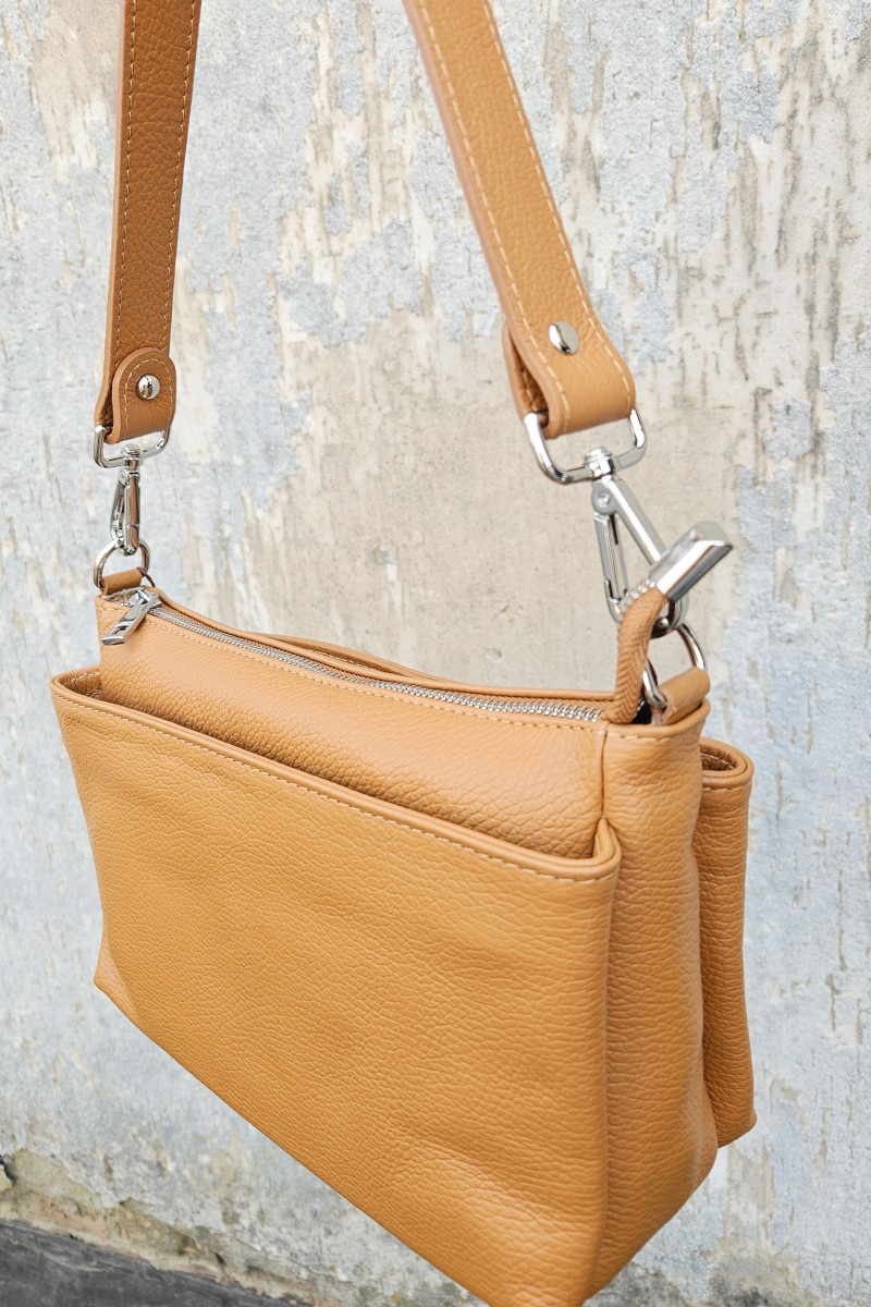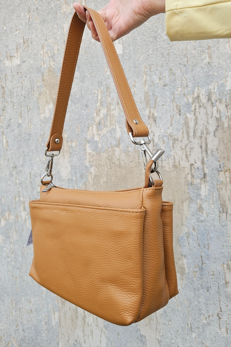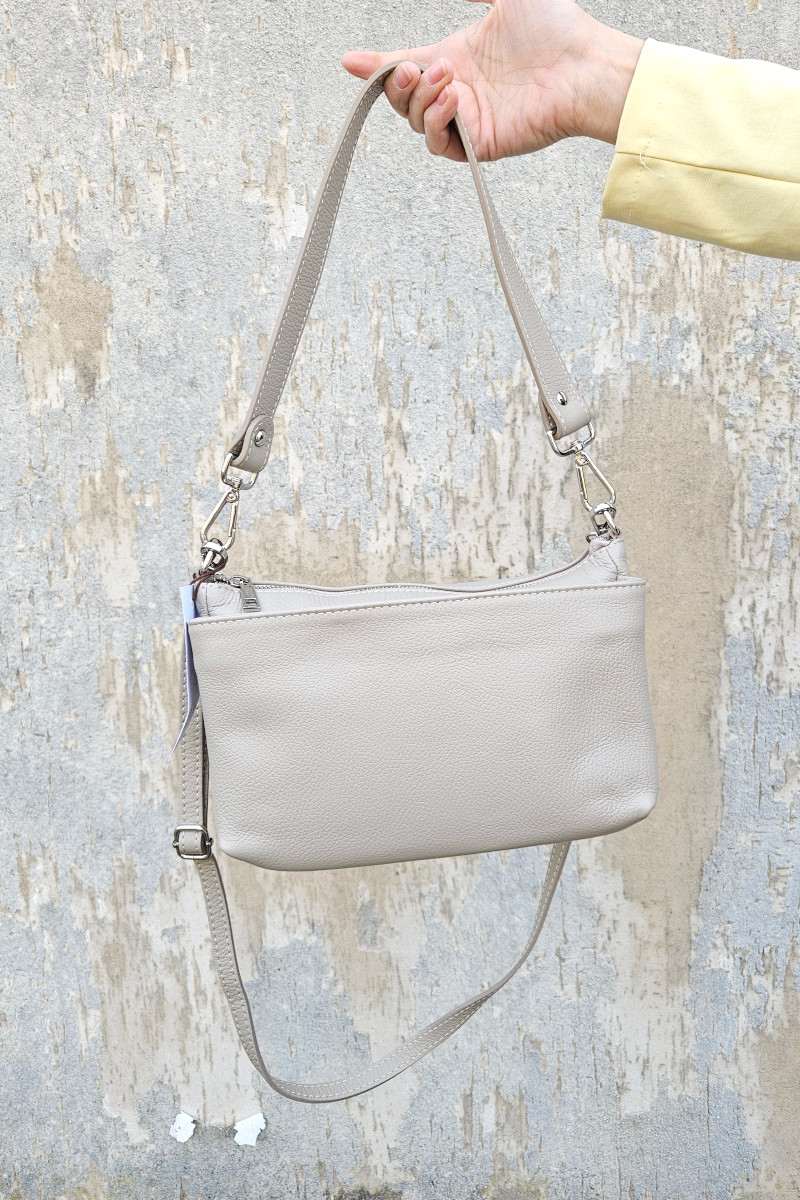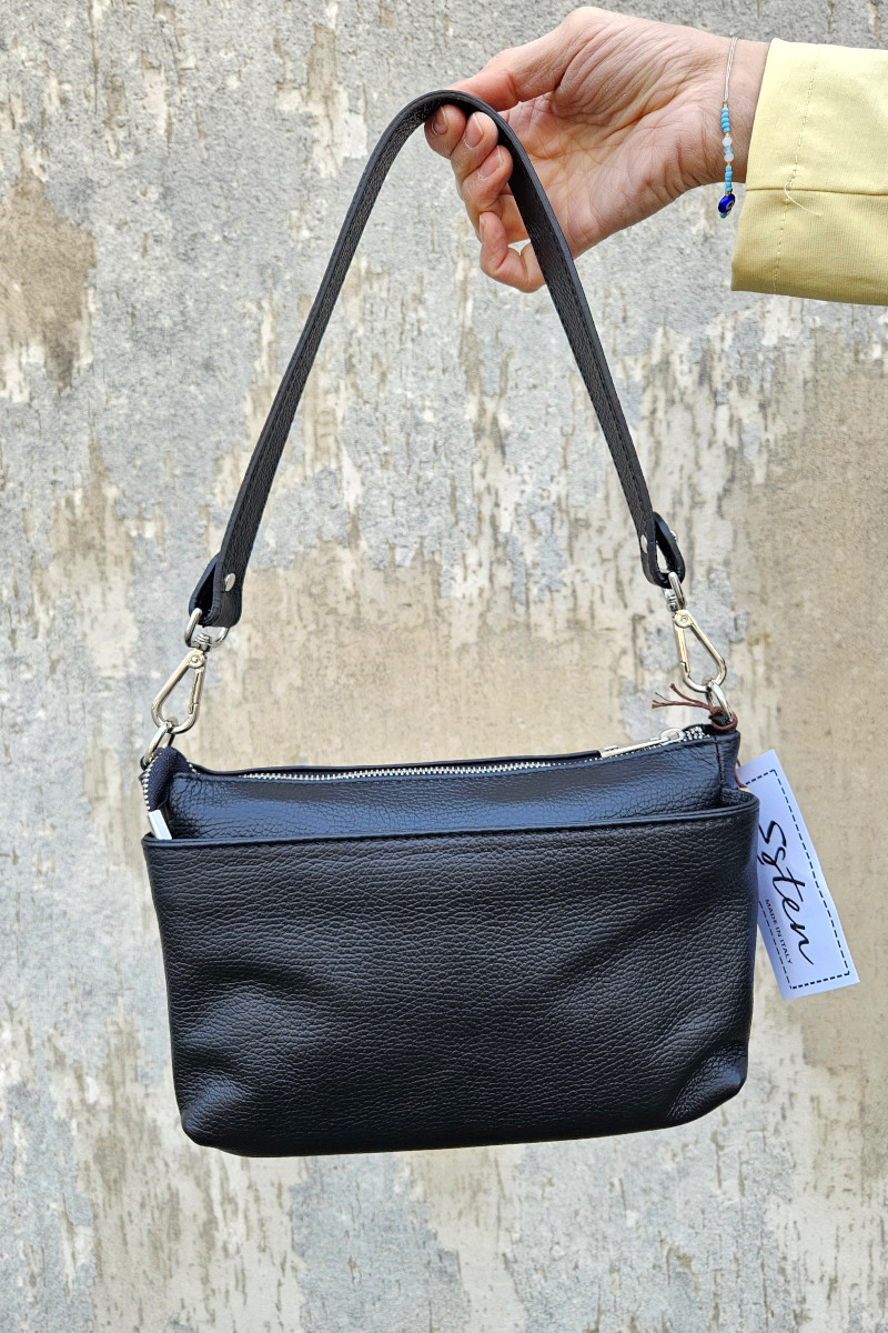 Borsa a spalla Esten realizzata in vera pelle martellata. Un modello semplice ma perfetto da indossare in ogni occasione. Dotata di 3 tasche con chiusura zip per poter organizzare al meglio le proprie cose. Made in Italy. Misure: 28x16x8