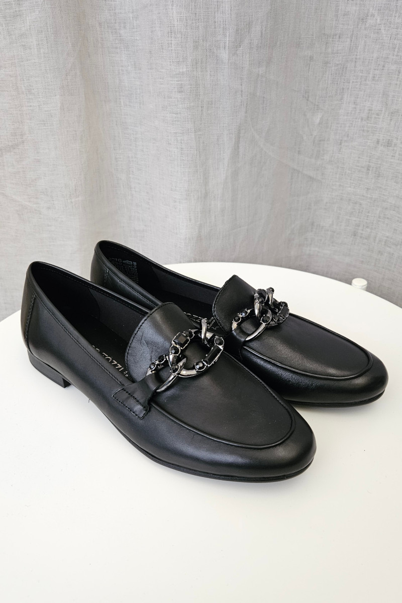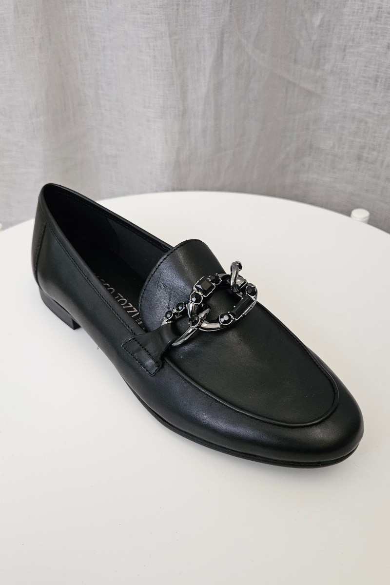 Mocassino donna Marco Tozzi realizzato in morbida pelle color Nero. Catena con pietre. Fodera in tessuto. Elegante e super comodo, perfetto per la mezza stagione.