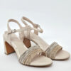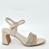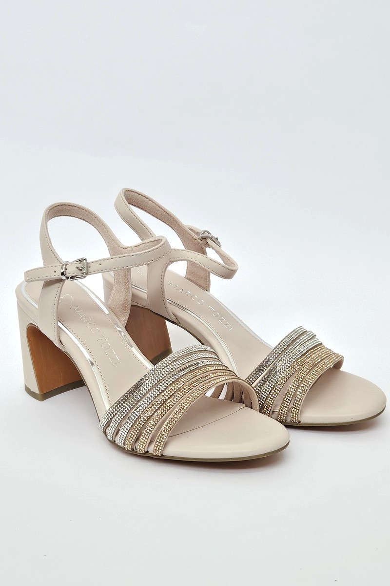 Sandalo in simil pelle color cipria Marco Tozzi con tacco 8 cm. Laccini con brillantini. Cinturino con fibbia alla caviglia.