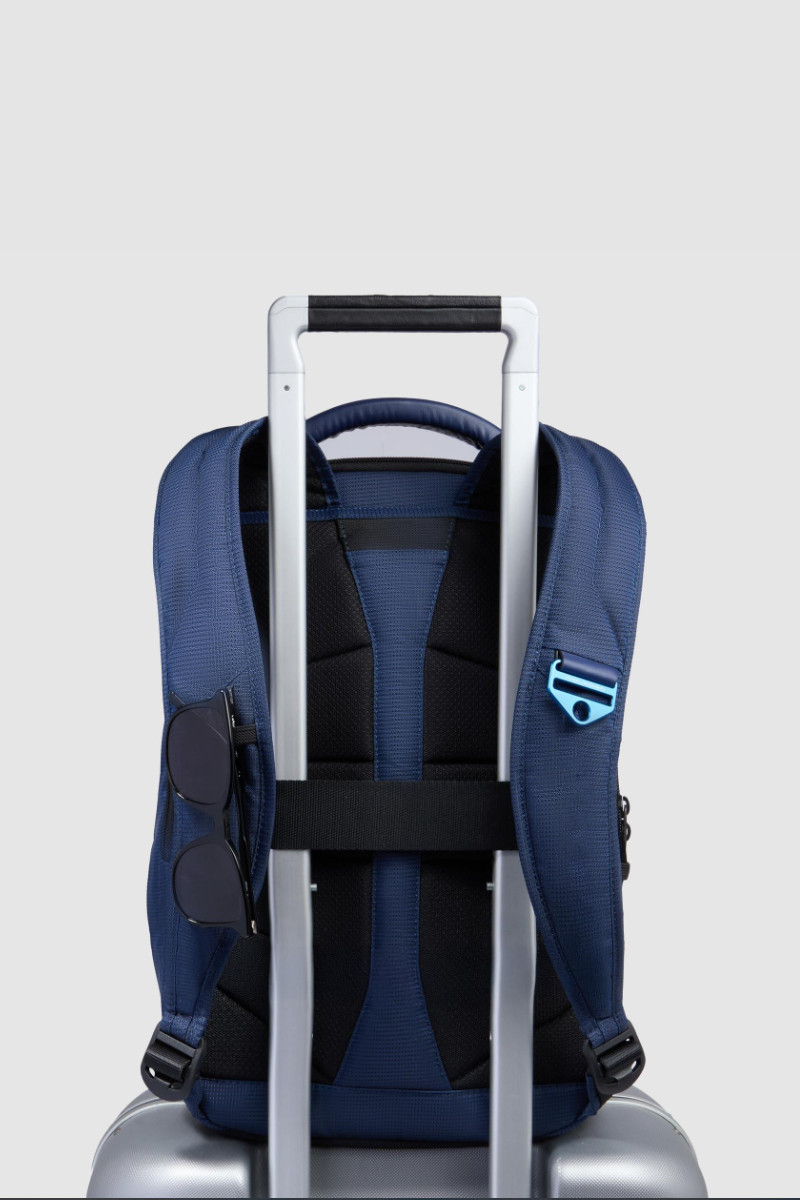 Zaino da viaggio PIQUADRO in tessuto riciclato e materiale bio-based con porta PC 14″ e protezione antiurto, compatibile con Easyjet. Super attrezzato per organizzare al meglio le proprie cose. Zaino viaggio/lavoro con cinghie ferma abiti. Questo zaino è dotato di protezioni antiurto e RFID. Misure: 27 x 41 x 15 cm