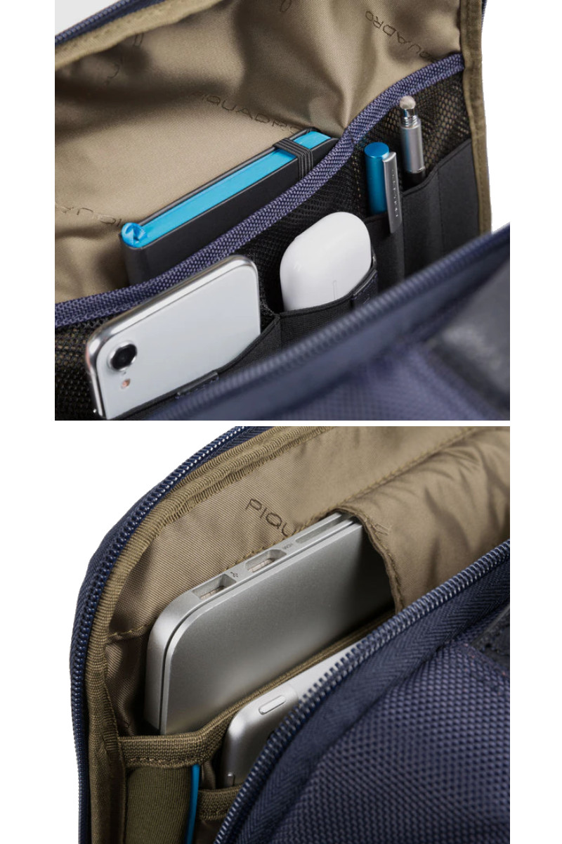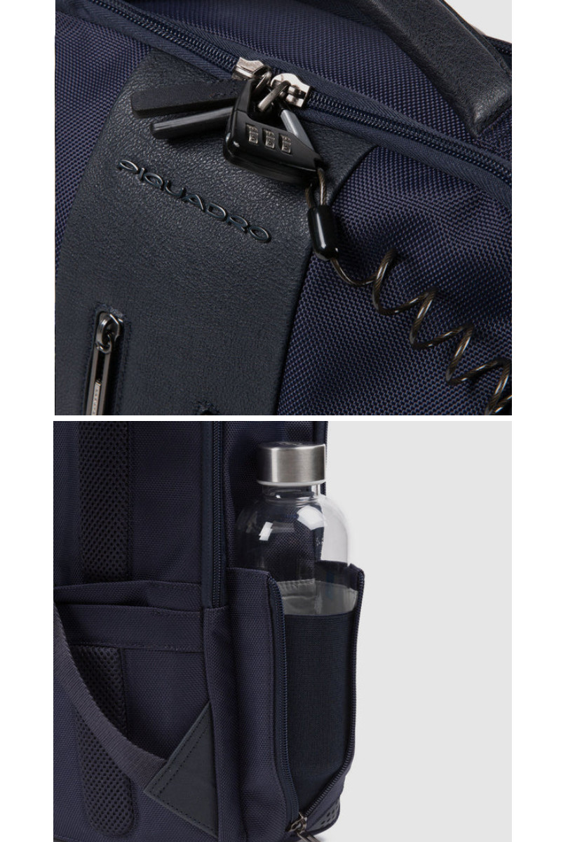 Zaino porta PC e porta iPad in tessuto riciclato ECO e pelle con cavo antifurto, protezioni antiurto e anti-frode RFID e tasca per AirPods. Uno zaino PIQUADRO super funzionale dotato di vari scomparti e tasche. Questo zaino da lavoro o studio è dotato di 2 grandi scomparti con chiusura zip. La tasca imbottita può contenere notebook da 15,6″ e iPad® 10,2”Air 10,9”Pro 11”. Zaino uomo in tessuto nylon 100% riciclato con spallacci regolabili, tasca laterali porta oggetti. Perfetto quindi per pendolari e per chi utilizza mezzi pubblici. Misure: 31x41x12 cm