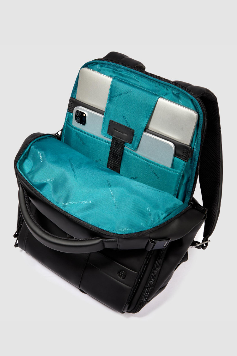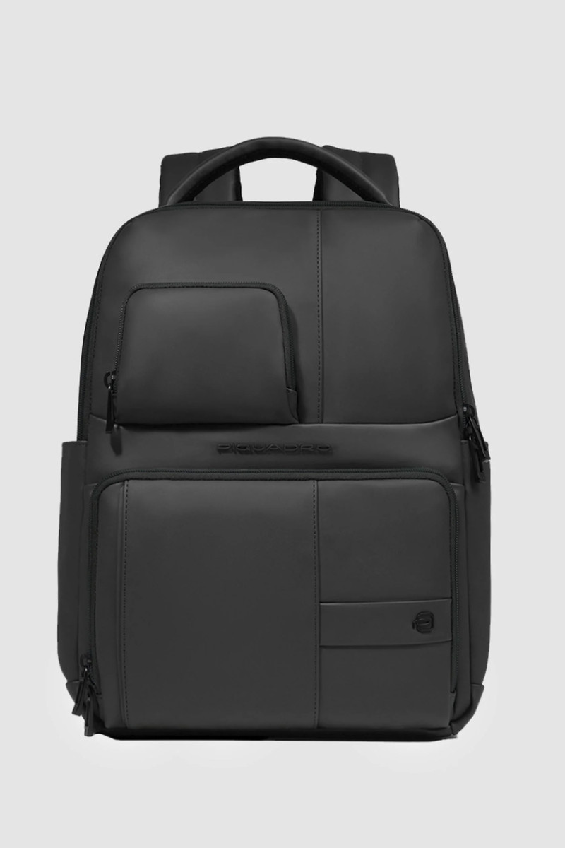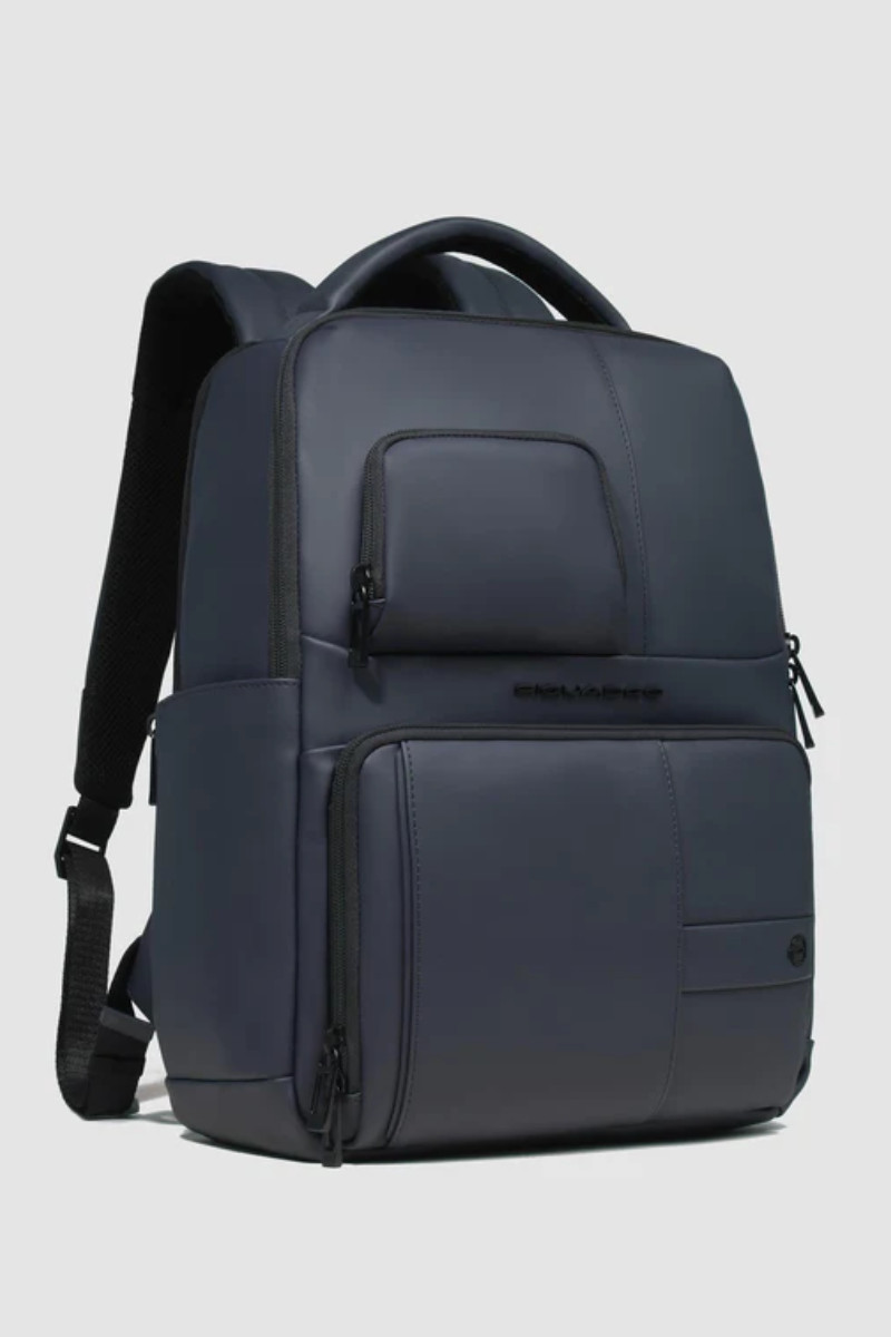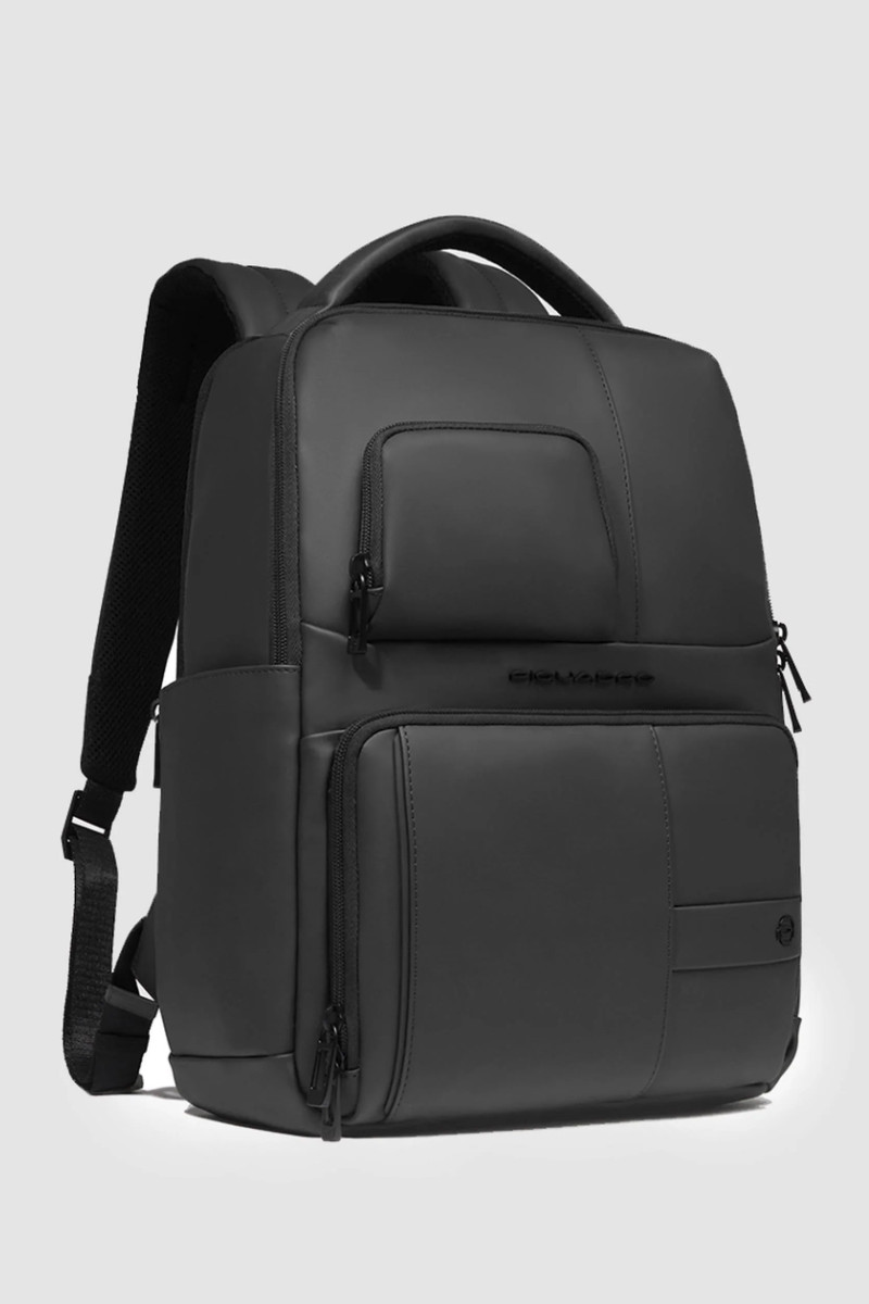 Zaino PIQUADRO uomo porta pc e porta iPad® in tessuto gommato resistente all’acqua con tasca per AirPods®, protezioni antiurto e RFID. Capienza 17 L, perfetto per lavoro e viaggio. Misure: 33x39x16 cm