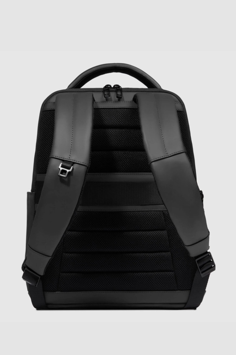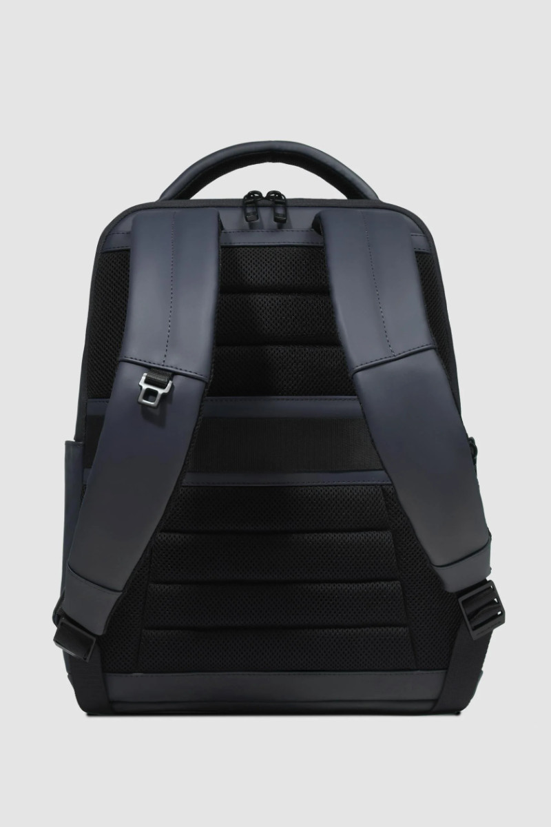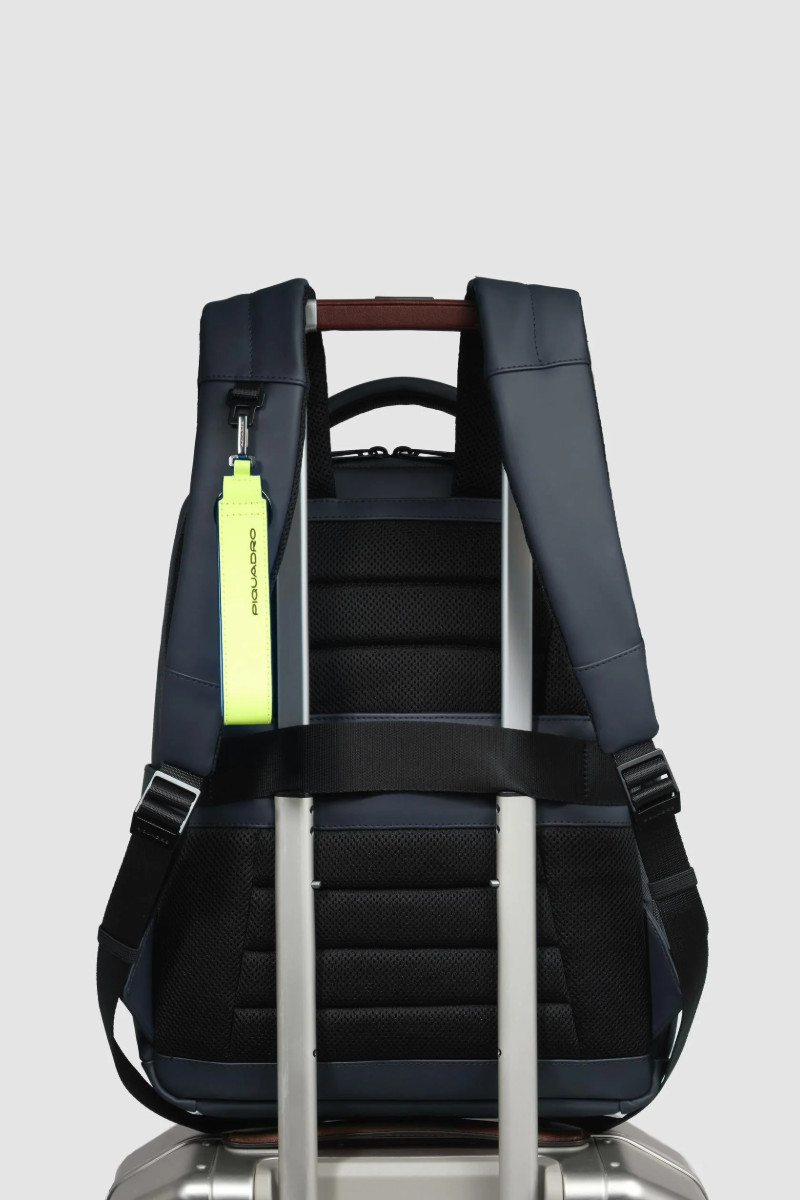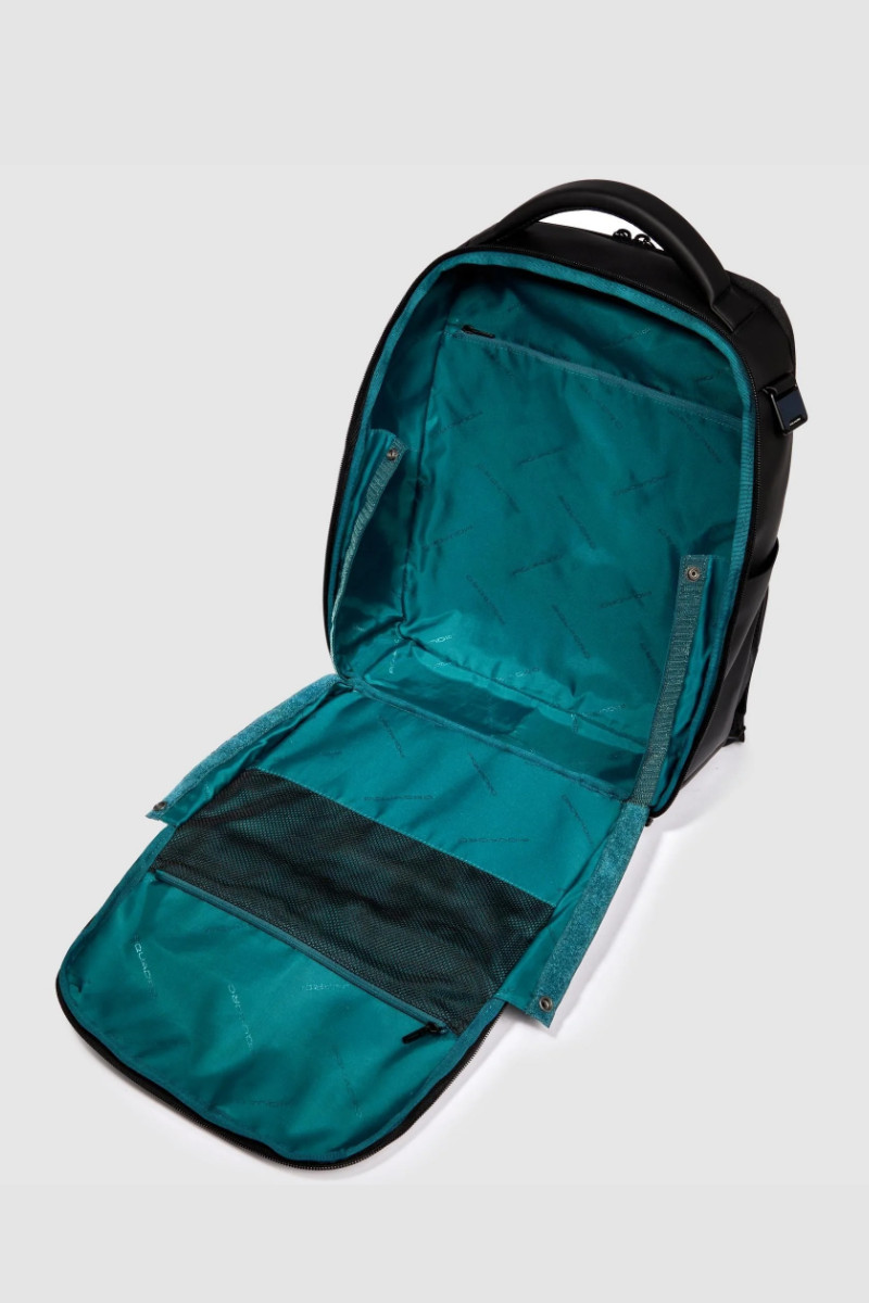 Zaino PIQUADRO uomo porta pc e porta iPad® in tessuto gommato resistente all’acqua con tasca per AirPods®, protezioni antiurto e RFID. Capienza 17 L, perfetto per lavoro e viaggio. Misure: 33x39x16 cm