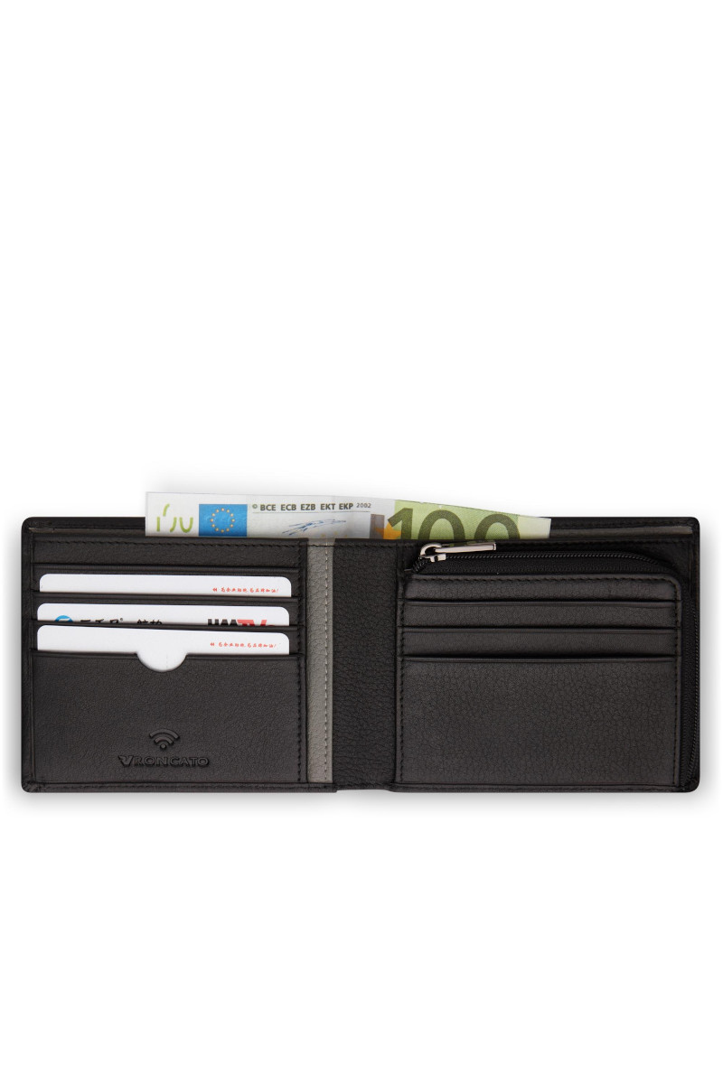 Portafoglio uomo Roncato realizzato in vera pelle con spazio per tessere e tasca zip per monete. Questo modello è dotato di schermatura RFID per proteggere le carte di credito da possibili clonazioni. Misure: 13x9x2 cm
