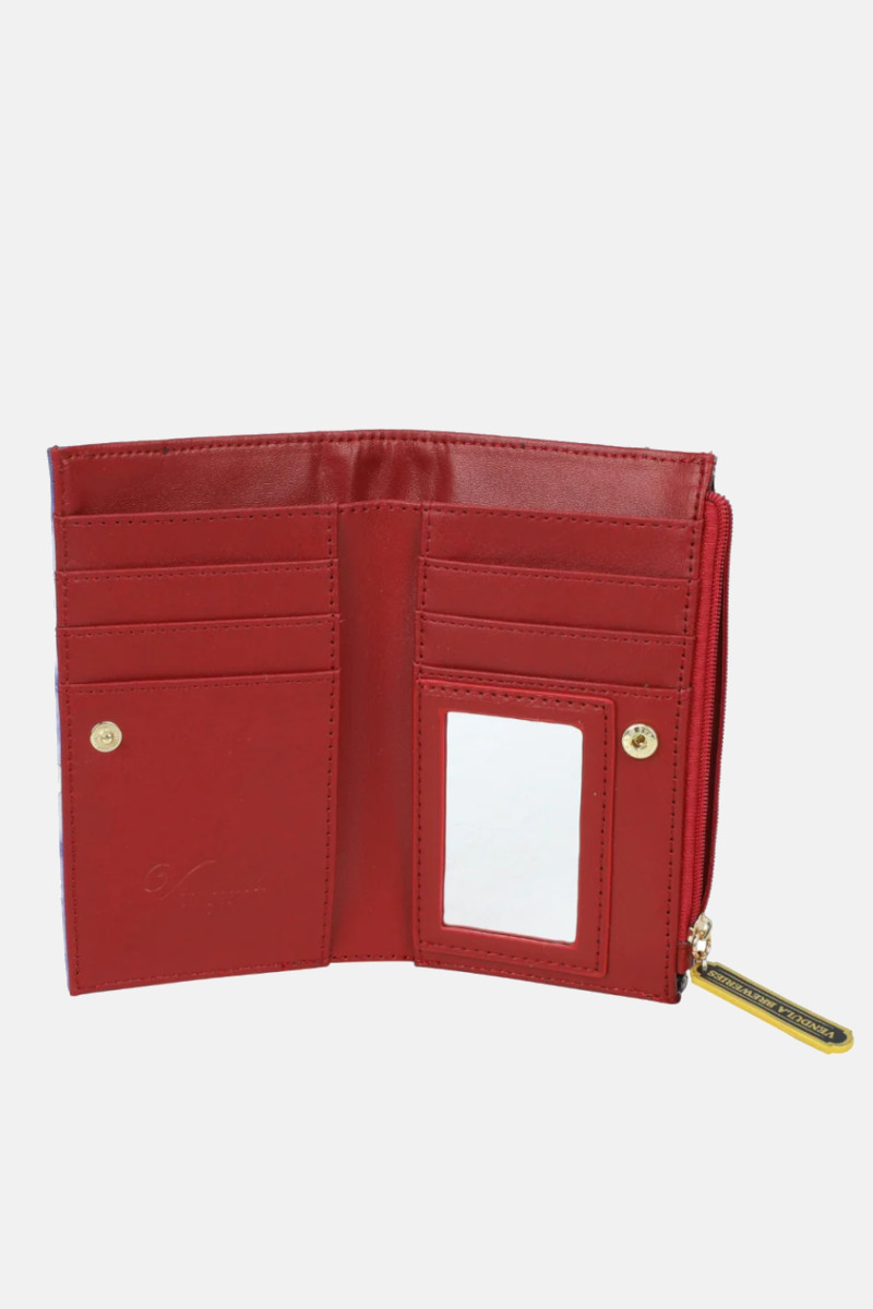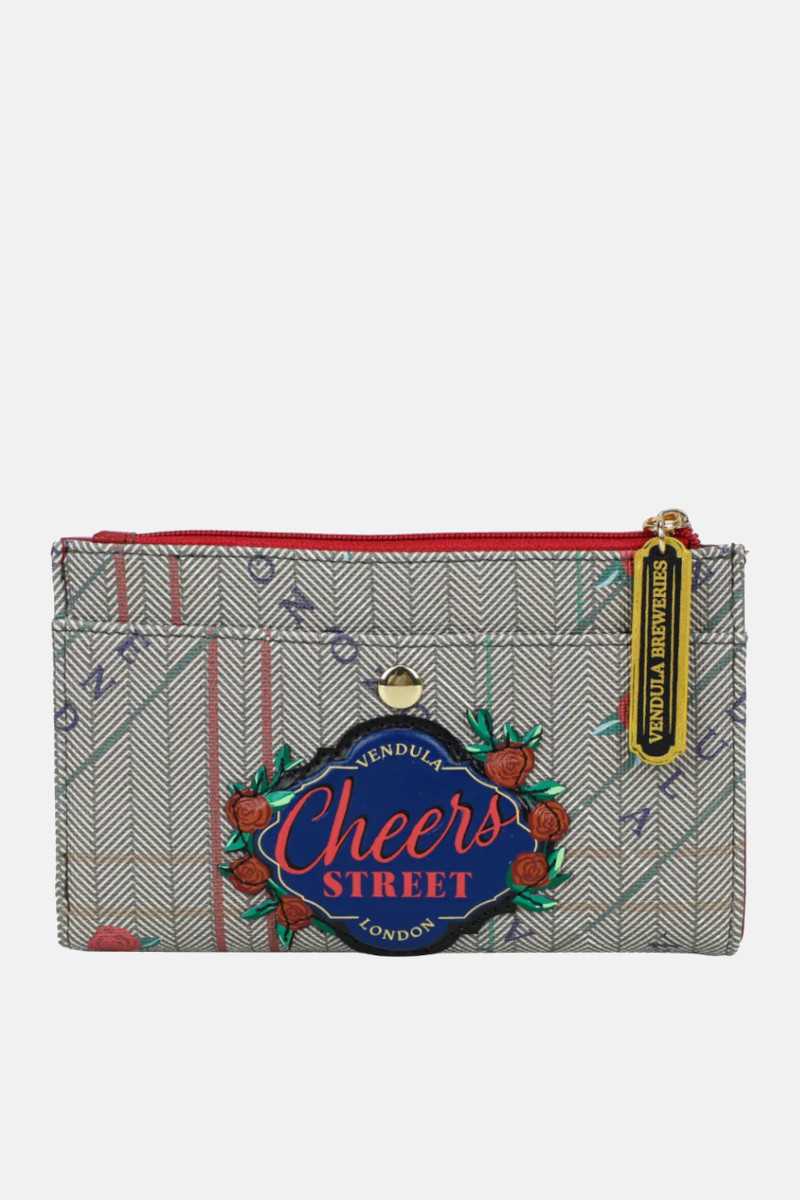 Portafoglio morbido Vendula London dotato di scomparti per terrese, tasca per monete e tasca profonda per banconote. Il tutto realizzato in pelle vegana stampa Cheers Street. Se ti sei stancata del classico portafoglio hai trovato il giusto sostituto che ti permetterà di organizzare al meglio le tue cose.